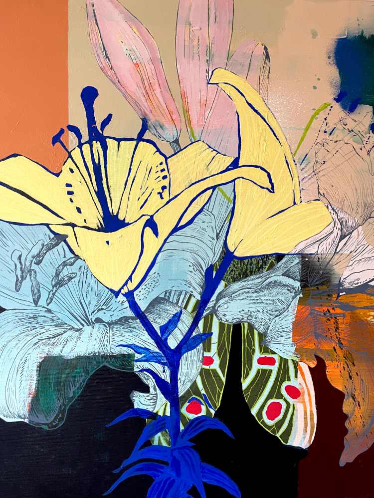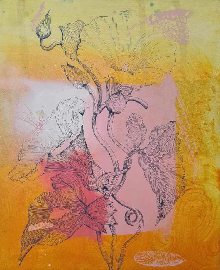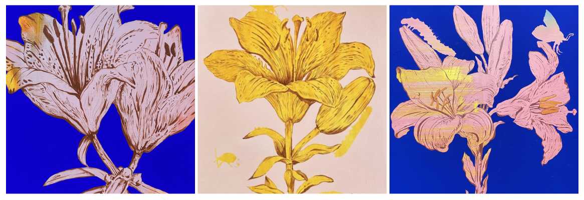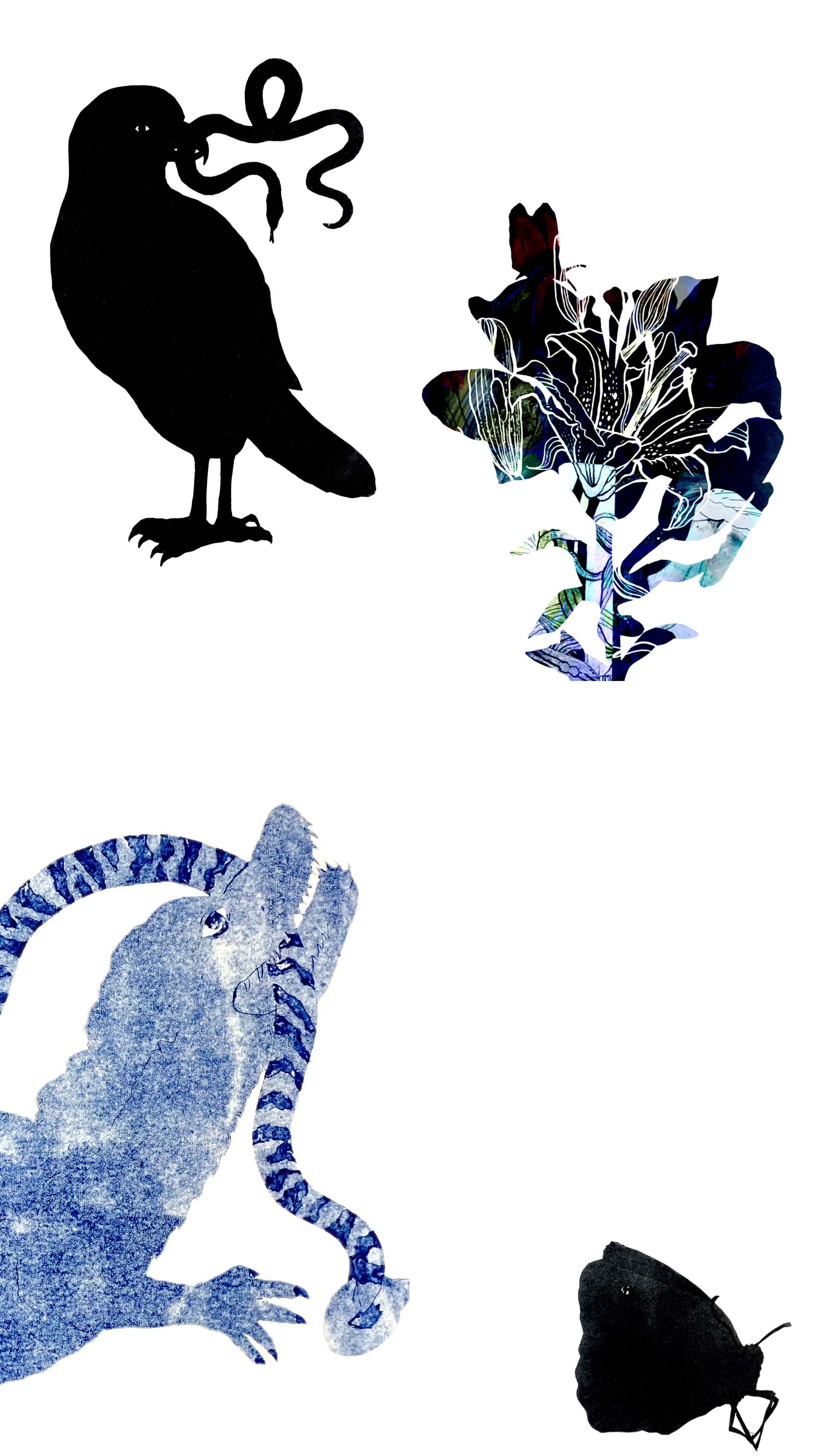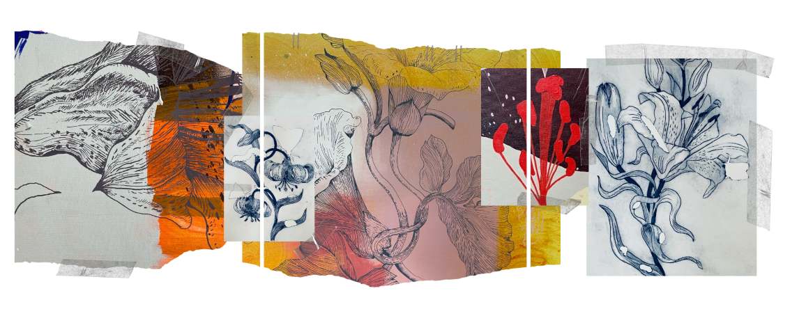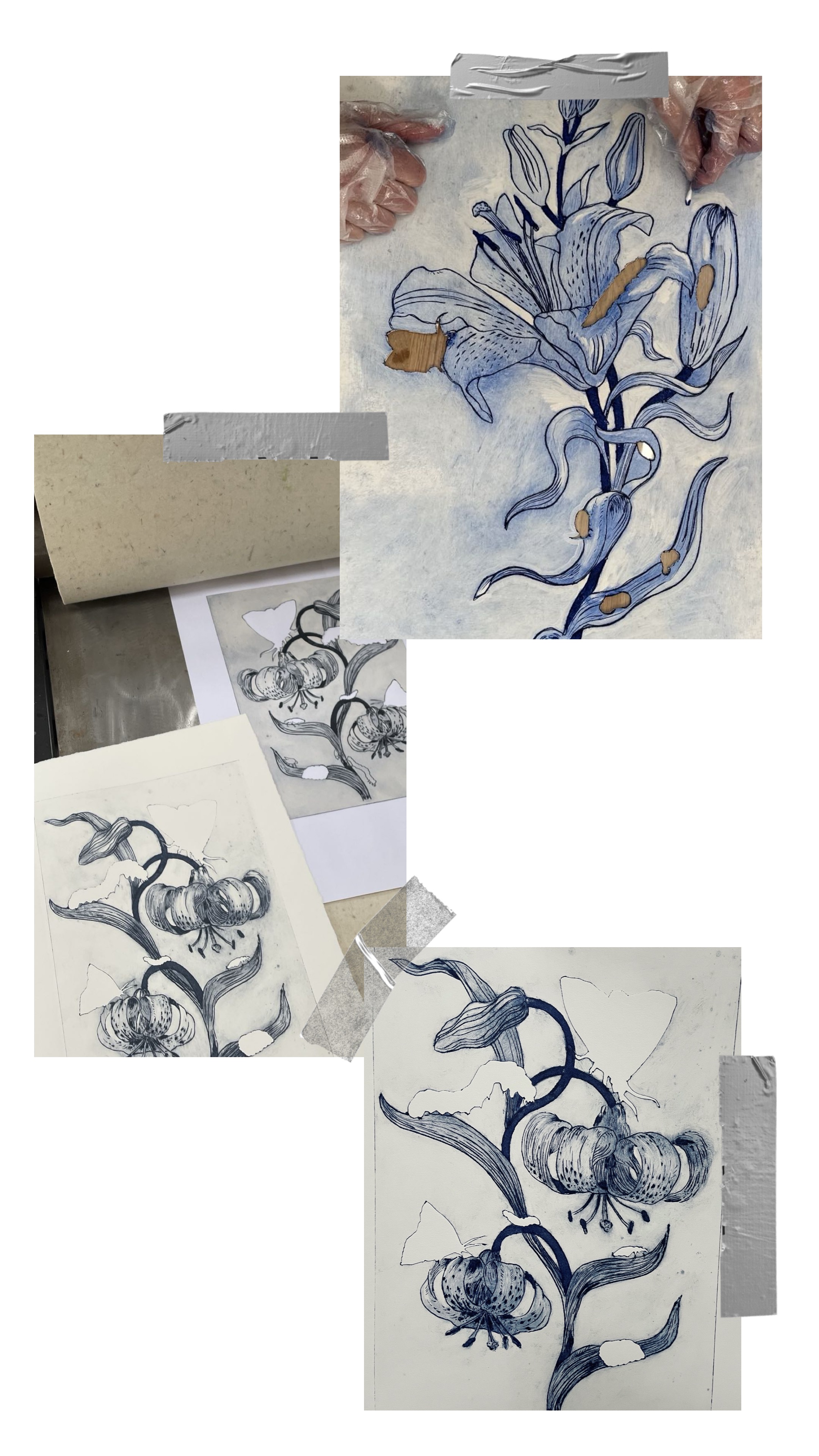 A central part of my artistic practice is devoted to printmaking, especially collagraphy. In this medium, I work freely and intuitively, often drawing inspiration from the botanical etchings of Maria Sibylla Merian from the early 1700s. Rather than replicating her work, I use it as a starting point — a visual score I can jam over, reinterpret, and respond to in my own way.